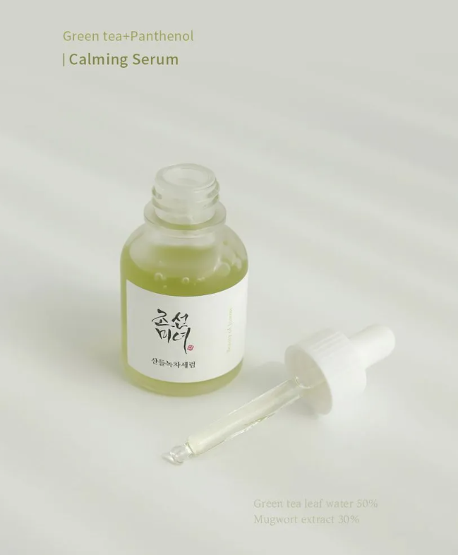 Serum Calmante de Beauty of Joseon contiene agua de té verde calmante y pantenol en una consistencia súper ligera.