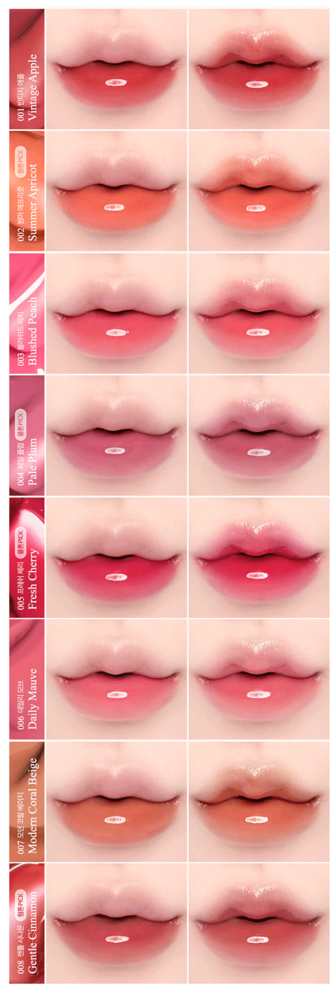 01 Vintage Apple 02 Summer Apricot 03 Blushed Peach 04 Pale Plum 05 Fresh Cherry 06 Daily Mauve 07 Modern Coral Beige 08 Gentle Cinammon