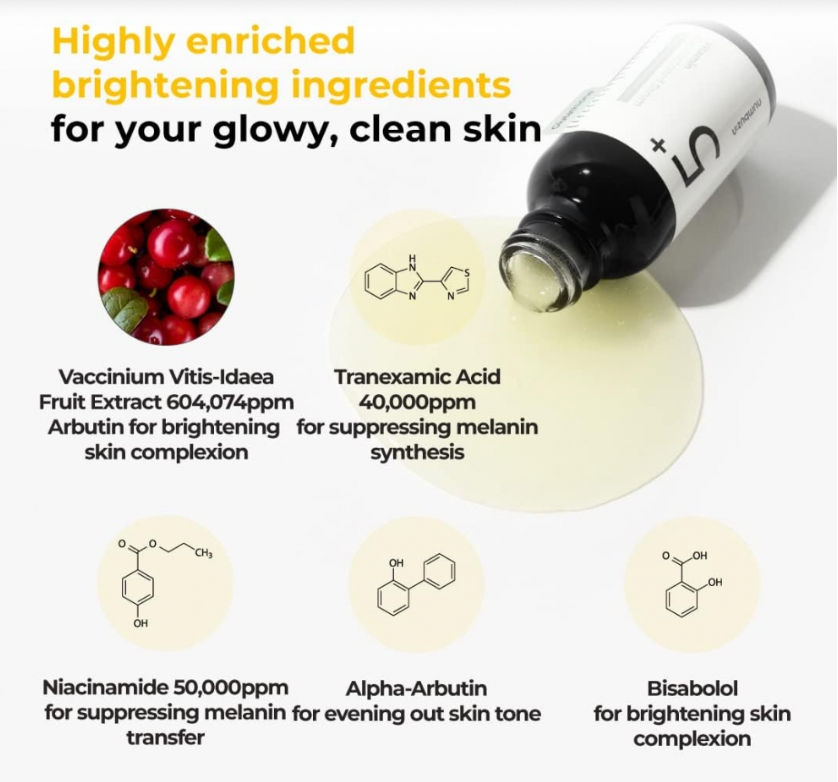 Una colección de ingredientes iluminadores que incluye glutatión, ácido alfa lipoico, vitamina C, niacinamida, ácido tranexámico, alfa-arbutina y bisabolol puede ayudar a desvanecer las manchas oscuras y dejar la piel clara y luminosa.