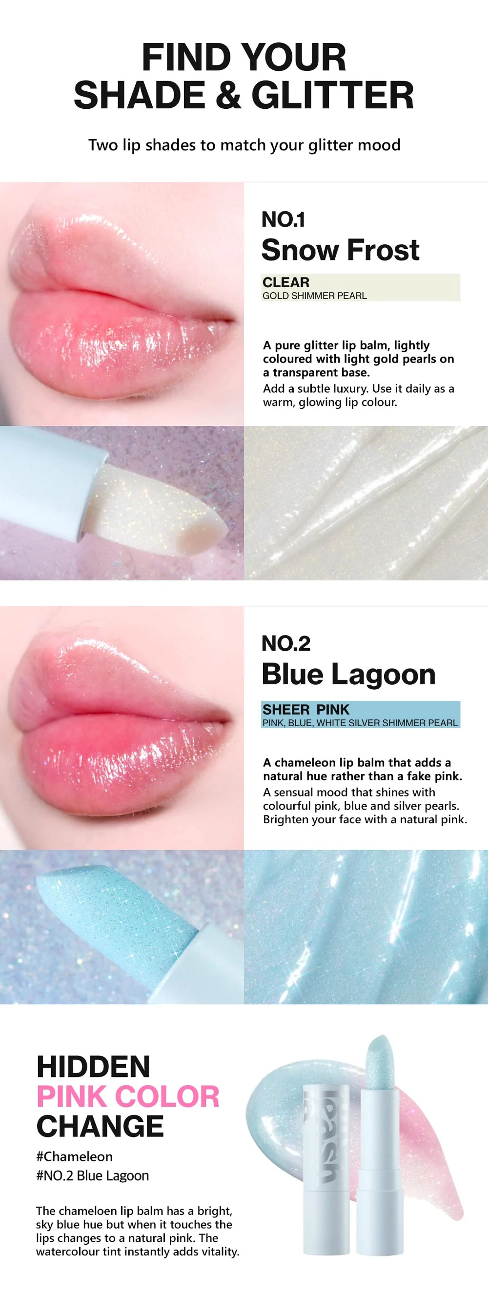 N°2 Blue Lagoon: Un bálsamo labial que cambia de color con perlas plateadas rosas, azules y blancas que cambiarán a rosa cuando se aplique en los labios.